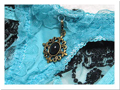 取り外し可能なチャームがブラのフロントに1つと、タンガのbackにも1つ付いています